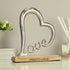 A curvy metal heart with "Love" wording sits on top of a rustic wooden plinth.